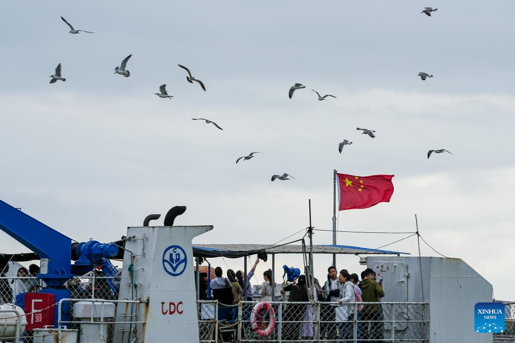 BEIJING, 4 octubre, 2025 (Xinhua) -- Imagen del 3 de octubre de 2025 de turistas dirigiéndose a las islas Miaodao en bote, en Yantai, en la provincia de Shandong, en el este de China. Los destinos turísticos de toda China están experimentando un aumento en el número de visitantes desde el miércoles con el comienzo de las vacaciones de ocho días por el Día Nacional y el Festival de Medio Otoño. (Xinhua/Zhu Zheng)