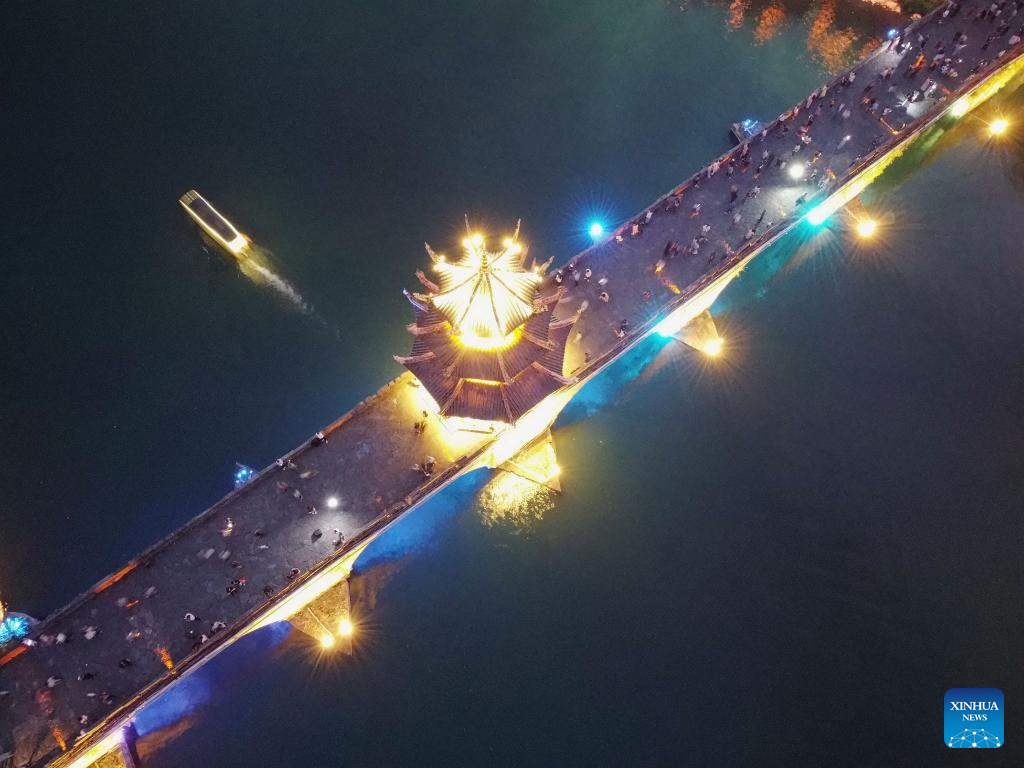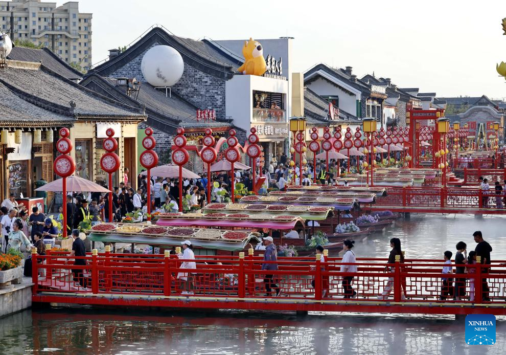 BEIJING, 4 octubre, 2025 (Xinhua) -- Imagen del 3 de octubre de 2025 de personas visitando el antiguo poblado de Hexia, en Huai'an, en la provincia de Jiangsu, en el este de China. Los destinos turísticos de toda China están experimentando un aumento en el número de visitantes desde el miércoles con el comienzo de las vacaciones de ocho días por el Día Nacional y el Festival de Medio Otoño. (Xinhua/Chen Qibao)