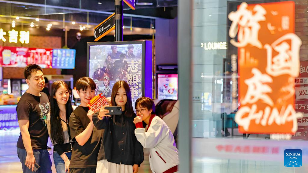BEIJING, 4 octubre, 2025 (Xinhua) -- Personas se toman fotografías con el cartel de una película en un cine, en Tianjin, en el norte de China, el 4 de octubre de 2025. Los destinos turísticos de toda China están experimentando un aumento en el número de visitantes desde el miércoles con el comienzo de las vacaciones de ocho días por el Día Nacional y el Festival de Medio Otoño. (Xinhua/Du Penghui)