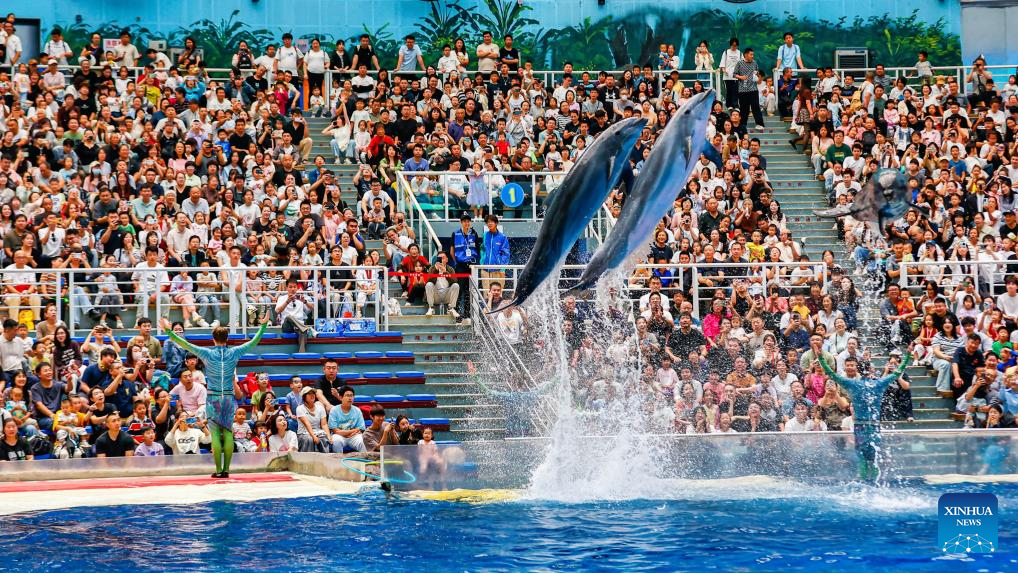 BEIJING, 4 octubre, 2025 (Xinhua) -- Turistas disfrutan de una presentación en un parque oceánico, en Tianjin, en el norte de China, el 4 de octubre de 2025. Los destinos turísticos de toda China están experimentando un aumento en el número de visitantes desde el miércoles con el comienzo de las vacaciones de ocho días por el Día Nacional y el Festival de Medio Otoño. (Xinhua/Du Penghui)