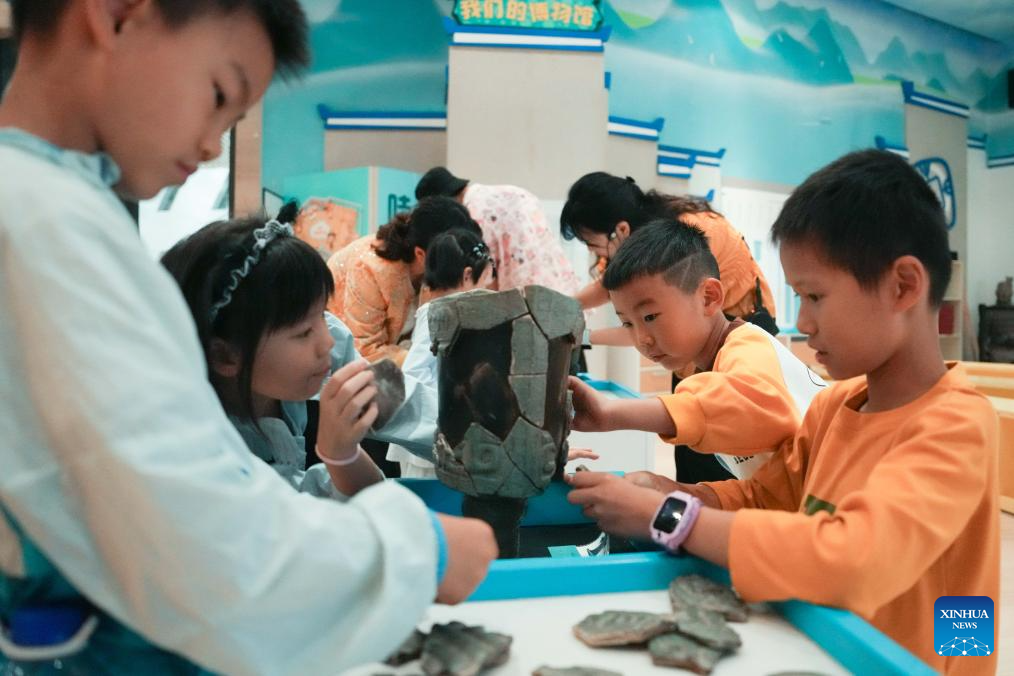 BEIJING, 4 octubre, 2025 (Xinhua) -- Niños aprenden sobre técnicas de restauración de reliquias culturales en el Museo de Changsha, en Changsha, en la provincia de Hunan, en el centro de China, el 4 de octubre de 2025. Los destinos turísticos de toda China están experimentando un aumento en el número de visitantes desde el miércoles con el comienzo de las vacaciones de ocho días por el Día Nacional y el Festival de Medio Otoño. (Xinhua/Xue Yuge)