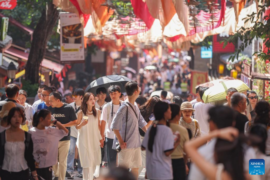 CHONGQING, 4 octubre, 2025 (Xinhua) -- Imagen del 1 de octubre de 2025 de turistas visitando un área escénica, en la municipalidad de Chongqing, en el suroeste de China. (Xinhua/Huang Wei)