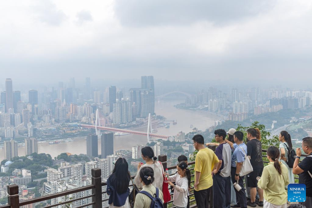 CHONGQING, 4 octubre, 2025 (Xinhua) -- Imagen del 2 de octubre de 2025 de turistas disfrutando la vista de la ciudad en una área escénica, en la municipalidad de Chongqing, en el suroeste de China. (Xinhua/Huang Wei)