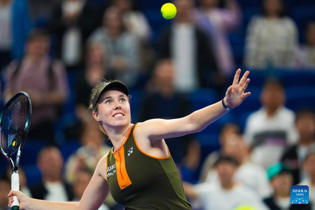 BEIJING, 4 octubre de 2025 (Xinhua) -- Linda Noskova sirve la pelota durante el partido de semifinales de individuales femeninos entre Linda Noskova, de la República Checa, y Jessica Pegula, de Estados Unidos, en el torneo de tenis China Open 2025, en Beijing, China, el 4 de octubre de 2025. (Xinhua/Xie Han)