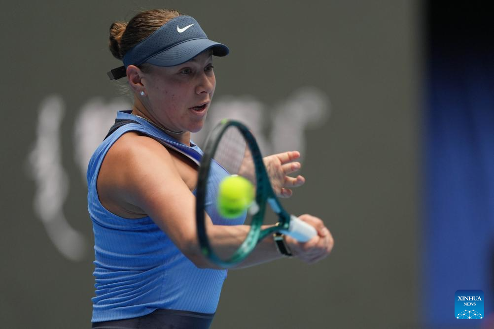BEIJING, 4 octubre, 2025 (Xinhua) -- Amanda Anisimova devuelve la pelota durante el partido de semifinal de individuales femeninos entre Coco Gauff, de Estados Unidos, y Amanda Anisimova, de Estados Unidos, en el torneo de tenis China Open 2025, en Beijing, China, el 4 de octubre de 2025. (Xinhua/Xie Han)