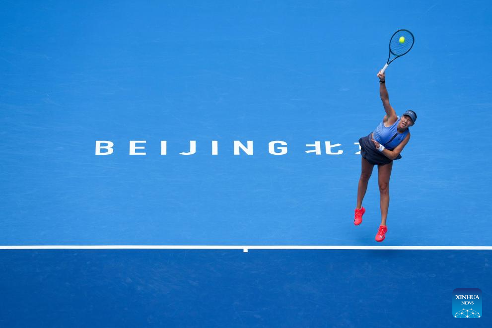 BEIJING, 4 octubre, 2025 (Xinhua) -- Amanda Anisimova sirve la pelota durante el partido de semifinal de individuales femeninos entre Coco Gauff, de Estados Unidos, y Amanda Anisimova, de Estados Unidos, en el torneo de tenis China Open 2025, en Beijing, China, el 4 de octubre de 2025. (Xinhua/Na Yuqi)