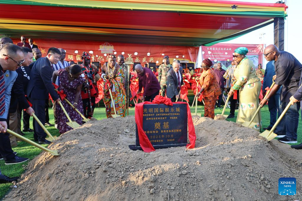 ACRA, 5 octubre, 2025 (Xinhua) -- Imagen del 4 de octubre de 2025 del presidente de Ghana, John Dramani Mahama (c), asistiendo a una ceremonia de colocación de primera piedra para el comienzo del Parque de Atracciones Internacional Bright, en Afienya, en la Región de Gran Acra, en Ghana. Una ceremonia de colocación de la primera piedra de un parque de atracciones ultramoderno construido por Greenhouse International Development Group, una empresa china, se celebró el sábado en Afienya, cerca de la ciudad portuaria de Tema, en Ghana. (Xinhua/Seth)