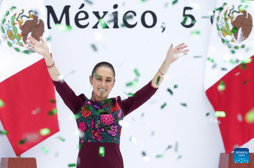 MÉXICO, 5 oct (Xinhua) -- La presidenta de México, Claudia Sheinbaum, celebró hoy domingo su primer año de Gobierno iniciado el 1 de octubre de 2024 con un mensaje público en la plaza central de la capital del país, en el que reafirmó su compromiso de defender al país y rechazó cualquier injerencia extranjera o violación del territorio mexicano.
