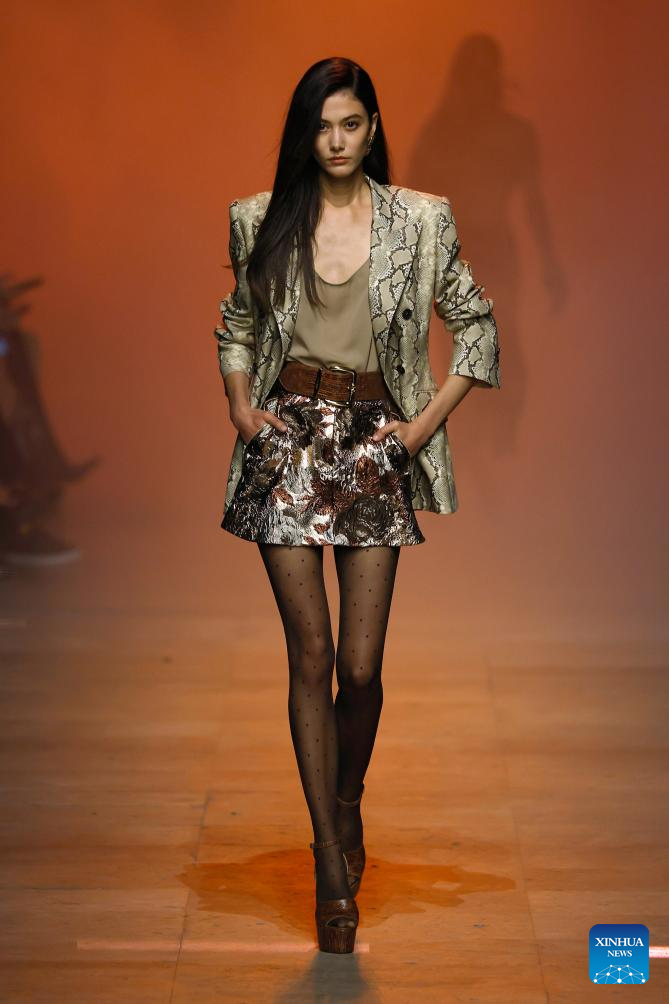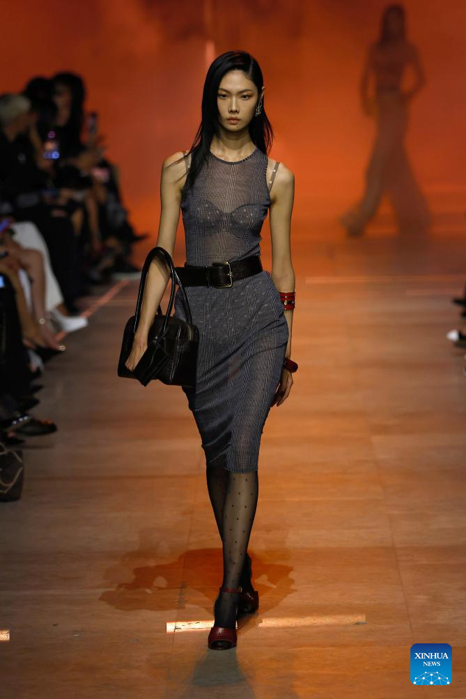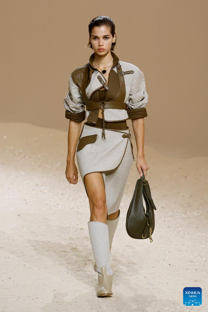 PARIS, 5 octubre, 2025 (Xinhua) -- Imagen del 4 de octubre de 2025 de una modelo presentando una creación de las colecciones listas para usar Primavera/Verano 2026 de Hermes durante la Semana de la Moda de París, en París, Francia. (Xinhua/MeetEurope)