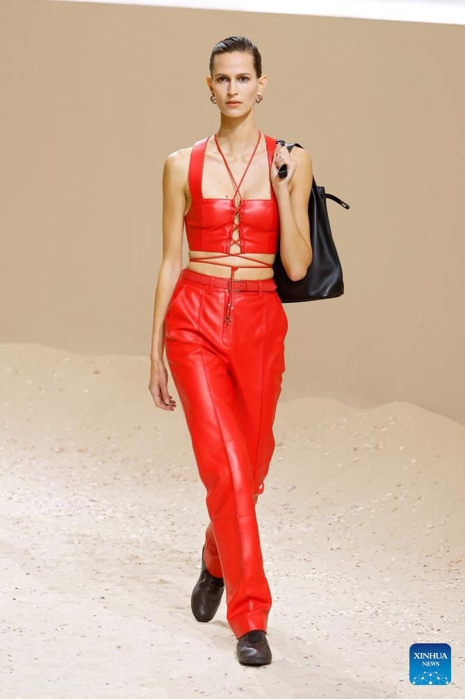 PARIS, 5 octubre, 2025 (Xinhua) -- Imagen del 4 de octubre de 2025 de modelos presentando creaciones de las colecciones listas para usar Primavera/Verano 2026 de Hermes durante la Semana de la Moda de París, en París, Francia. (Xinhua/MeetEurope)