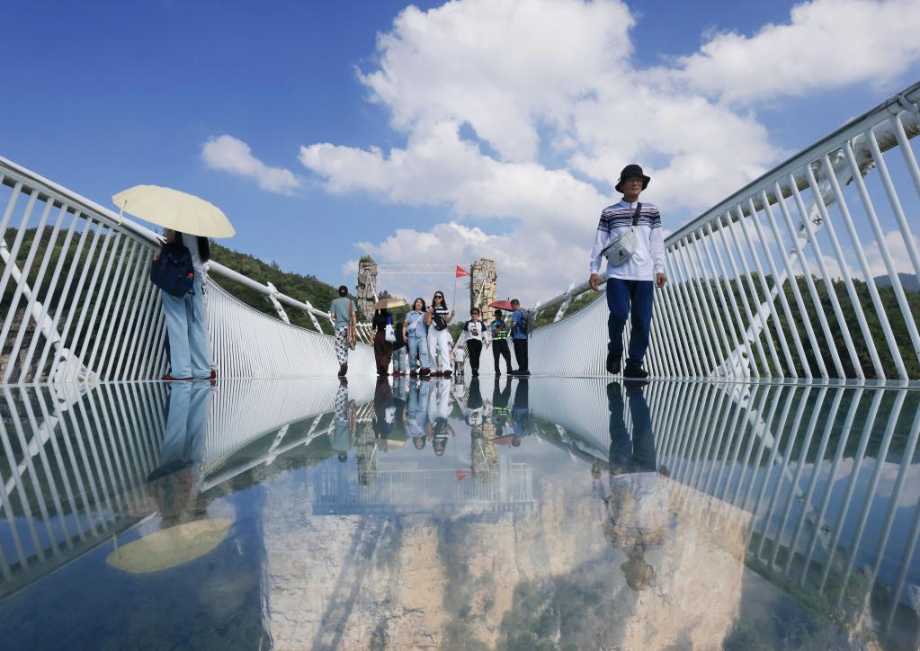 ZHANGJIAJIE, 5 octubre, 2025 (Xinhua) -- Turistas visitan un puente con suelo de cristal en el Gran Cañón de Zhangjiajie, en la provincia de Hunan, en el centro de China, el 5 de octubre de 2025. Los destinos turísticos de toda China están experimentando un aumento en el número de visitantes desde que el miércoles comenzó el feriado de ocho días por el Día Nacional y el Festival del Medio Otoño. (Xinhua/Wu Yongbing)