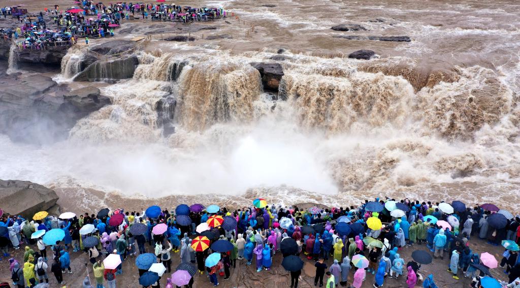 JIXIAN, 5 octubre, 2025 (Xinhua) -- Vista aérea tomada el 5 de octubre de 2025 de personas visitando la cascada Hukou en el río Amarillo, en el distrito de Jixian, en la provincia de Shanxi, en el norte de China. Los destinos turísticos de toda China están experimentando un aumento en el número de visitantes desde que el miércoles comenzó el feriado de ocho días por el Día Nacional y el Festival del Medio Otoño. (Xinhua/Lyu Guiming)