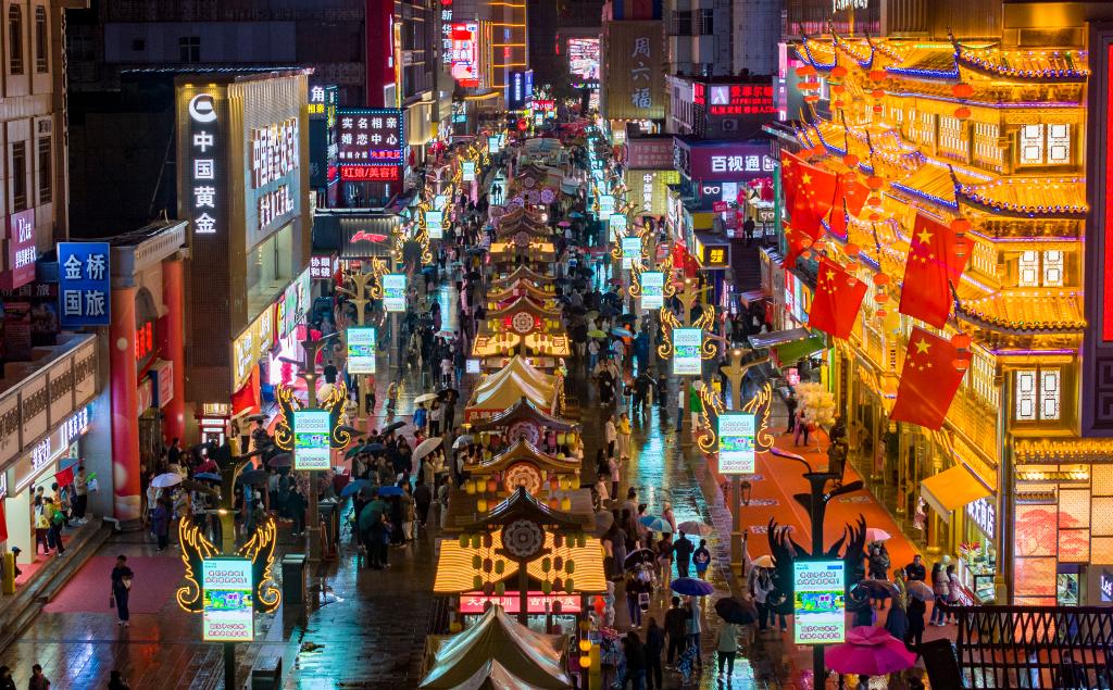 YINCHUAN, 5 octubre, 2025 (Xinhua) -- Vista aérea tomada con un dron el 5 de octubre de 2025 de personas visitando la calle peatonal Drum Tower, en Yinchuan, capital de la región autónoma hui de Ningxia, en el noroeste de China. Los destinos turísticos de toda China están experimentando un aumento en el número de visitantes desde que el miércoles comenzó el feriado de ocho días por el Día Nacional y el Festival del Medio Otoño. (Xinhua/Yang Zhisen)