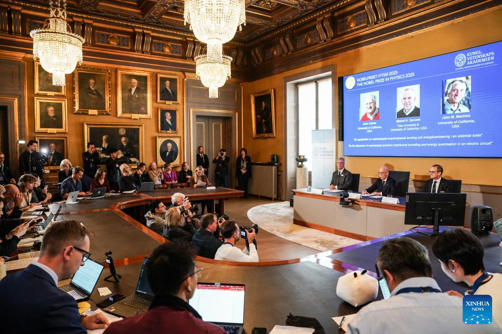 El Premio Nobel de Física 2025 es anunciado en Estocolmo, Suecia, el 7 de octubre de 2025. John Clarke, Michel H. Devoret y John M. Martinis, tres científicos radicados en Estados Unidos, han sido galardonados con el Premio Nobel de Física 2025 por el descubrimiento del efecto túnel cuántico macroscópico y la cuantización de la energía en un circuito eléctrico, anunció el martes la Real Academia de Ciencias de Suecia. (Xinhua/Peng Ziyang)