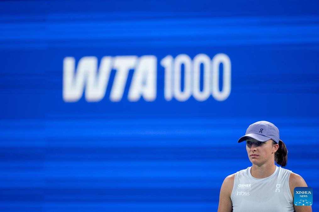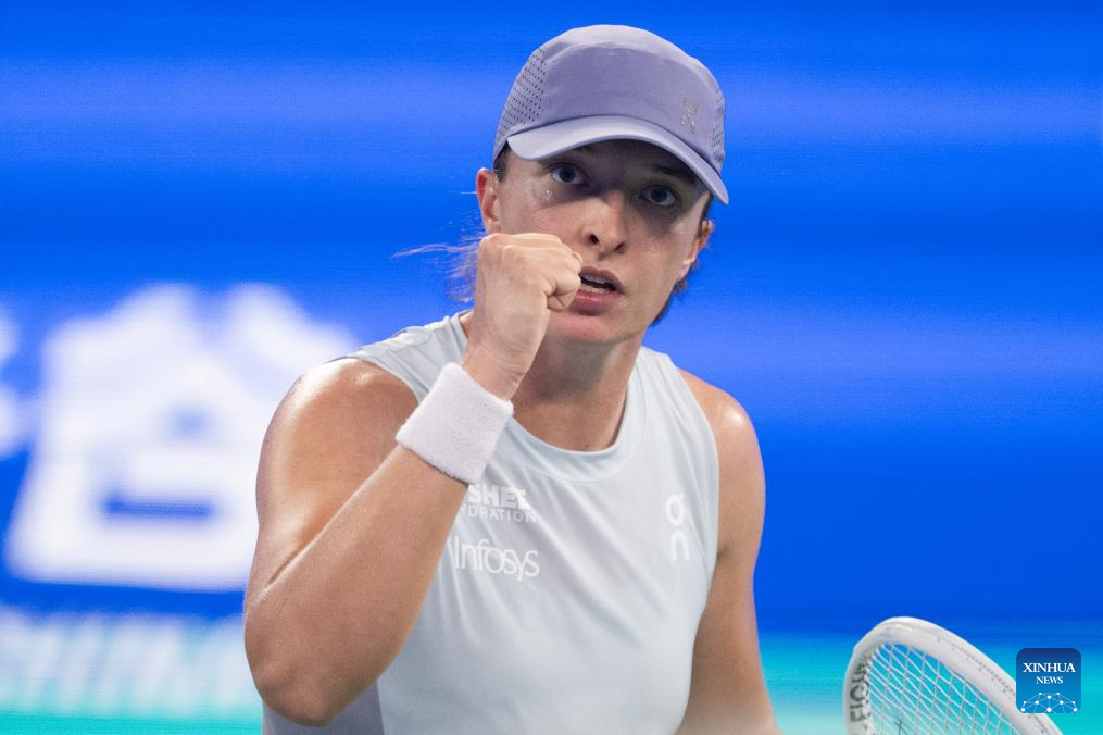 WUHAN, 7 octubre, 2025 (Xinhua) -- Iga Swiatek, de Polonia, reacciona durante el partido de dieciseisavos de final de individuales femeninos ante Marie Bouzkova, de República Checa, en el torneo de tenis Wuhan Open 2025, en Wuhan, en la provincia de Hubei, en el centro de China, el 7 de octubre de 2025. (Xinhua/Xiao Yijiu)