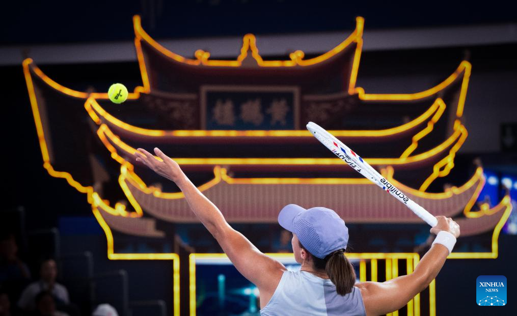 WUHAN, 7 octubre, 2025 (Xinhua) -- Iga Swiatek, de Polonia, sirve la pelota durante el partido de dieciseisavos de final de individuales femeninos ante Marie Bouzkova, de República Checa, en el torneo de tenis Wuhan Open 2025, en Wuhan, en la provincia de Hubei, en el centro de China, el 7 de octubre de 2025. (Xinhua/Xiao Yijiu)
