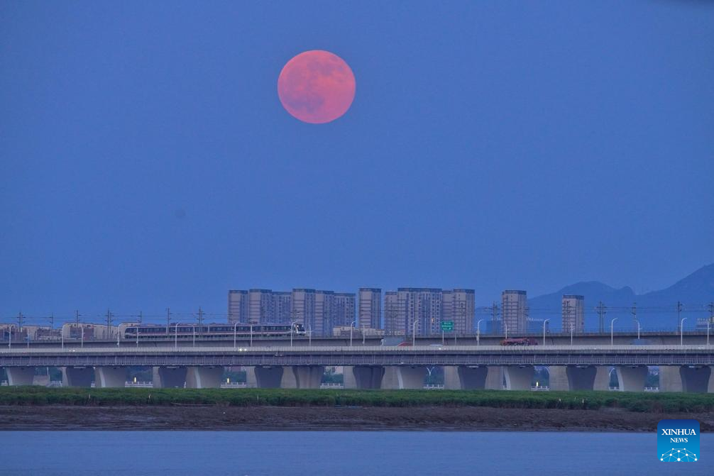 WENZHOU, 7 octubre, 2025 (Xinhua) -- La luna llena es vista sobre un tren en marcha, en la ciudad de Wenzhou, en la provincia de Zhejiang, en el este de China, el 7 de octubre de 2025. (Xinhua/Su Qiaojiang)