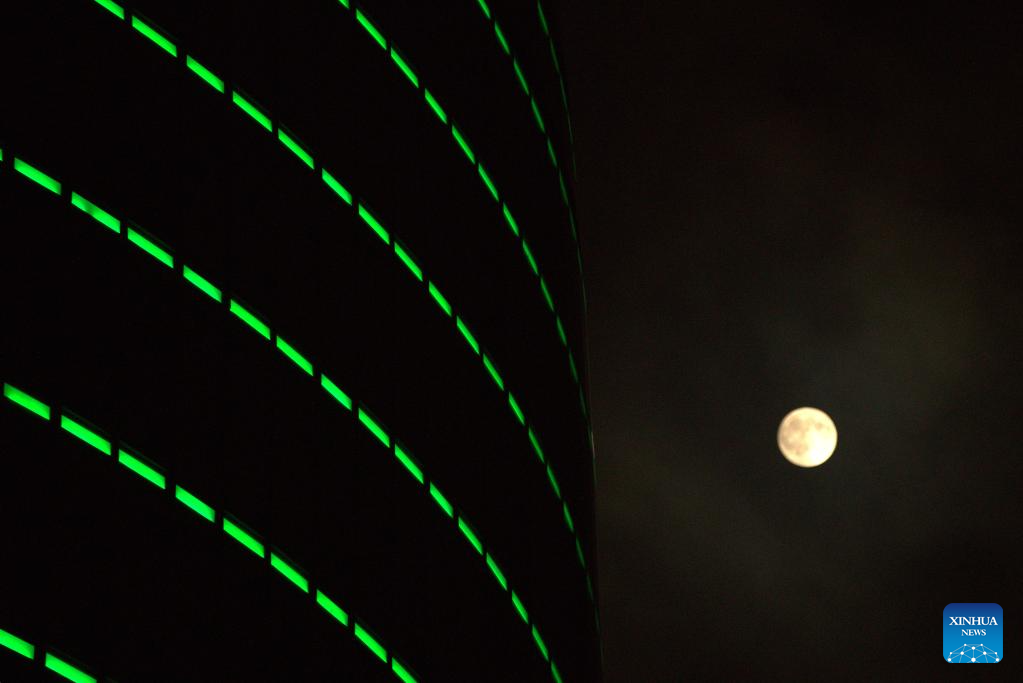 BAKU, 7 octubre, 2025 (Xinhua) -- Imagen del 6 de octubre de 2025 de la luna llena vista en el cielo sobre Bakú, Azerbaiyán. (Xinhua/Chen Junfeng)