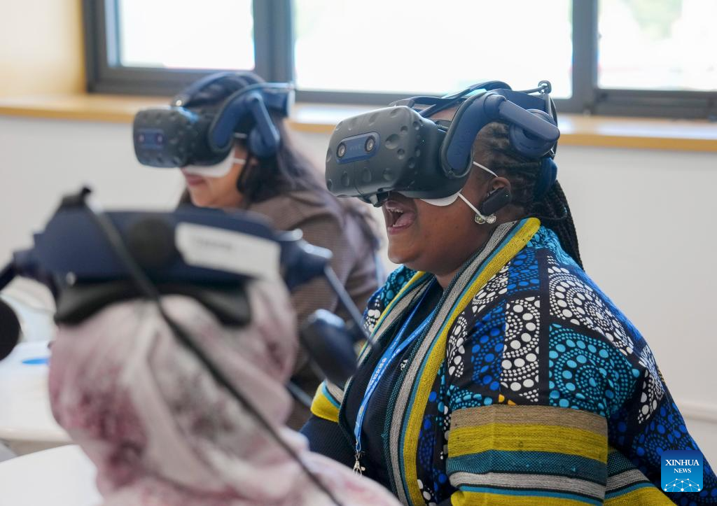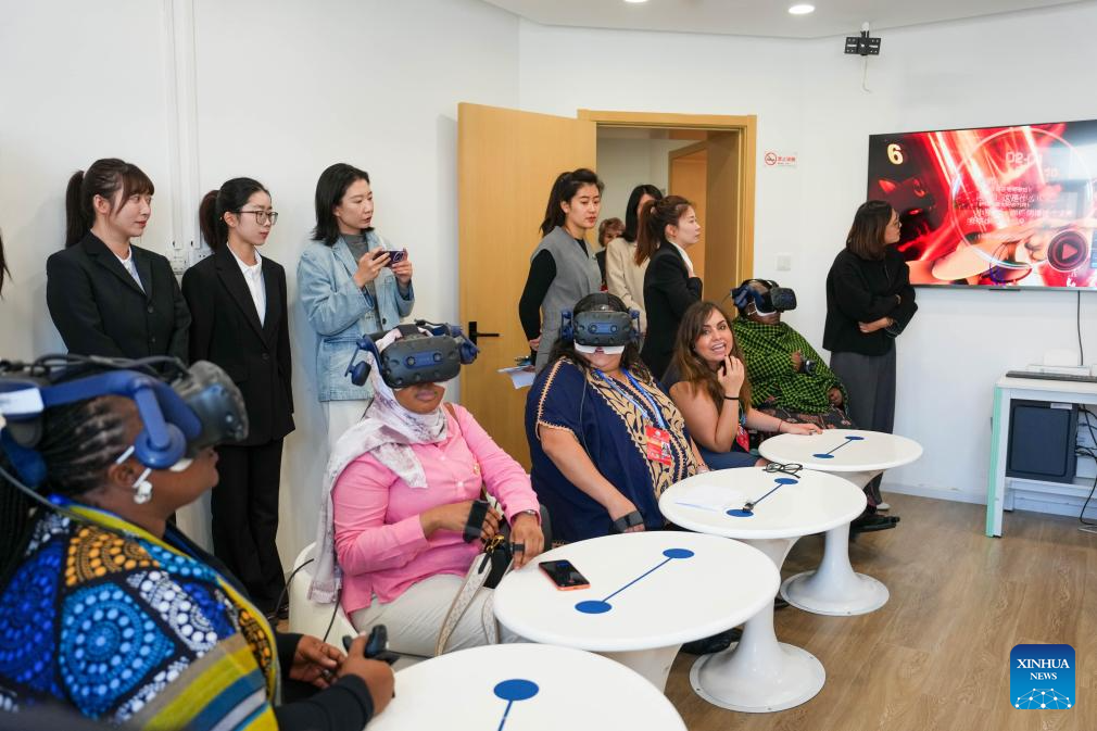 BEIJING, 14 octubre, 2025 (Xinhua) -- Representantes que se encuentran en Beijing para la Conferencia de Líderes Mundiales sobre la Mujer, prueban dispositivos de realidad virtual en un centro de servicios sociales para mujeres y niñas, en el distrito de Shunyi, en Beijing, capital de China, el 14 de octubre de 2025. (Xinhua/Yan Linyun)