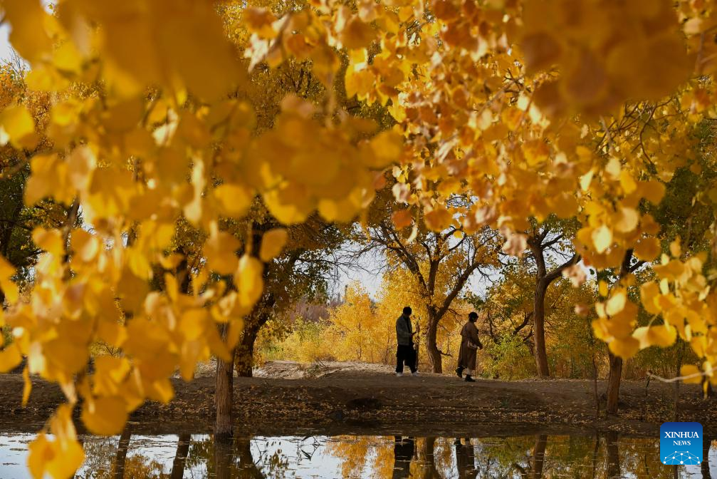 DUNHUANG, 15 octubre, 2025 (Xinhua) -- Imagen del 14 de octubre de 2025 de turistas disfrutando del paisaje en un bosque de Populus euphratica, en la ciudad de Dunhuang, en la provincia de Gansu, en el noroeste de China. (Xinhua/Zhang Xiaoliang)