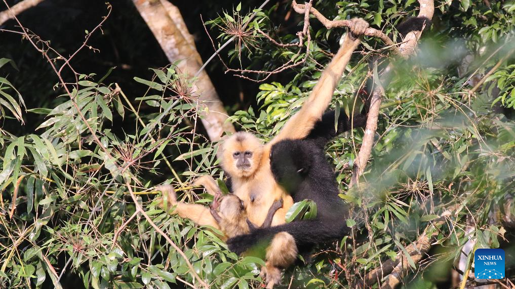 HAIKOU, 16 octubre, 2025 (Xinhua) -- Imagen del 29 de febrero de 2024 de gibones de Hainan en el área de Bawangling del Parque Nacional de la Selva Tropical de Hainan, en la provincia de Hainan, en el sur de China. Este octubre se celebra el cuarto aniversario del Parque Nacional de la Selva Tropical de Hainan. Durante los últimos cuatro años, este vasto ecosistema ha presentado un excelente "informe ecológico", que muestra el notable progreso de China en la conservación de la biodiversidad y la restauración del hábitat. (Xinhua/ La administración del Parque Nacional de la Selva Tropical de Hainan)
