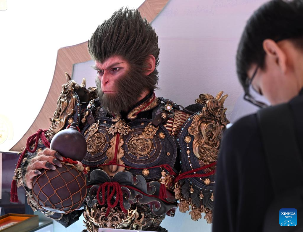 QINGDAO, 16 octubre, 2025 (Xinhua) -- Una exhibición del videojuego "Black Myth: Wukong" es vista en la décima Exposición Internacional de los Derechos de Autor de China, en Qingdao, en la provincia de Shandong, en el este de China, el 16 de octubre de 2025. Con el tema "La Inteligencia Digital Lidera el Futuro, los Derechos de Autor Promueven el Desarrollo Innovador", la décima Exposición Internacional de los Derechos de Autor de China y el Foro Internacional de los Derechos de Autor 2025 se inauguraron el jueves en Qingdao. (Xinhua/Li Ziheng)
