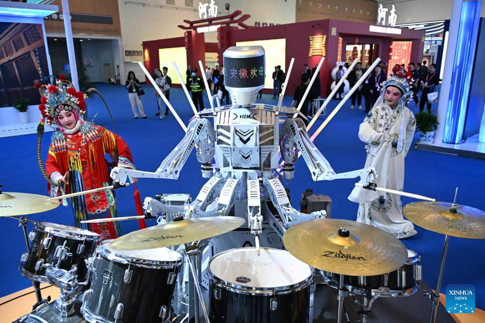 QINGDAO, 16 octubre, 2025 (Xinhua) -- Un robot toca la batería en la décima Exposición Internacional de los Derechos de Autor de China, en Qingdao, en la provincia de Shandong, en el este de China, el 16 de octubre de 2025. Con el tema "La Inteligencia Digital Lidera el Futuro, los Derechos de Autor Promueven el Desarrollo Innovador", la décima Exposición Internacional de los Derechos de Autor de China y el Foro Internacional de los Derechos de Autor 2025 se inauguraron el jueves en Qingdao. (Xinhua/Li Ziheng)