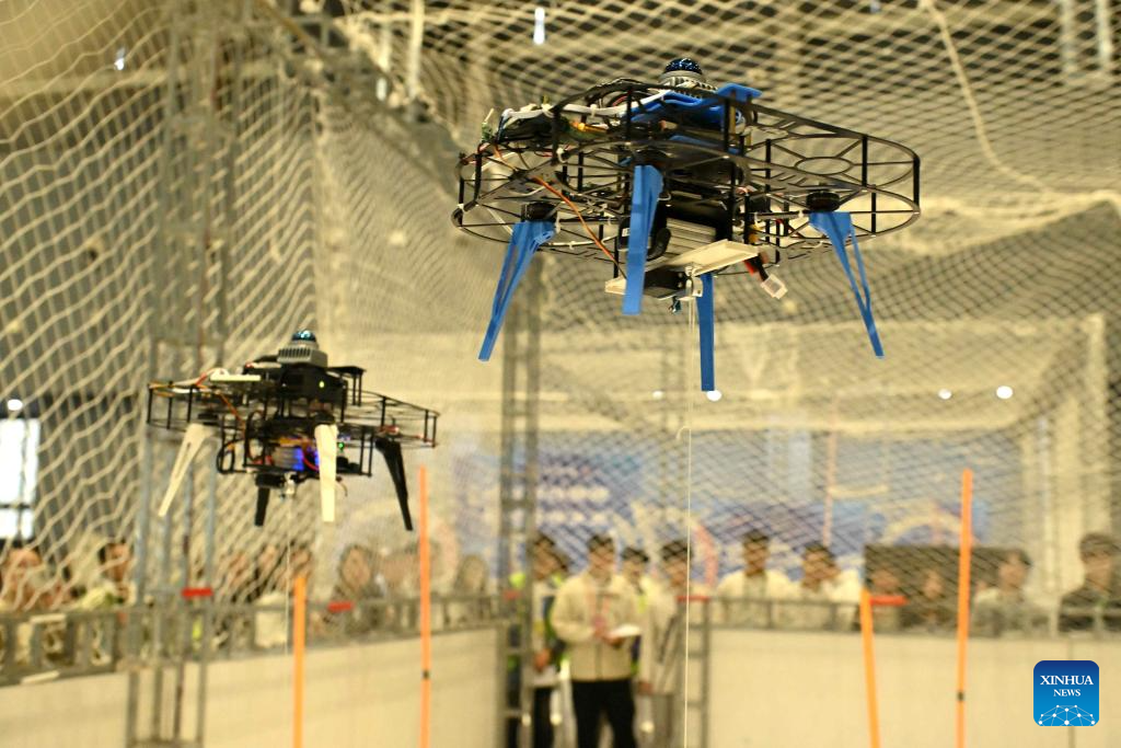 SHIJIAZHUANG, 17 octubre, 2025 (Xinhua) -- Una competencia de desafío de drones se lleva a cabo en el Centro Internacional de Convenciones y Exposiciones, en Shijiazhuang, en la provincia de Hebei, en el norte de China, el 17 de octubre de 2025. La Competencia de Robots de China 2025 y el RoboCup China Open se celebran aquí desde el viernes hasta el domingo. (Xinhua/Chen Qibao)