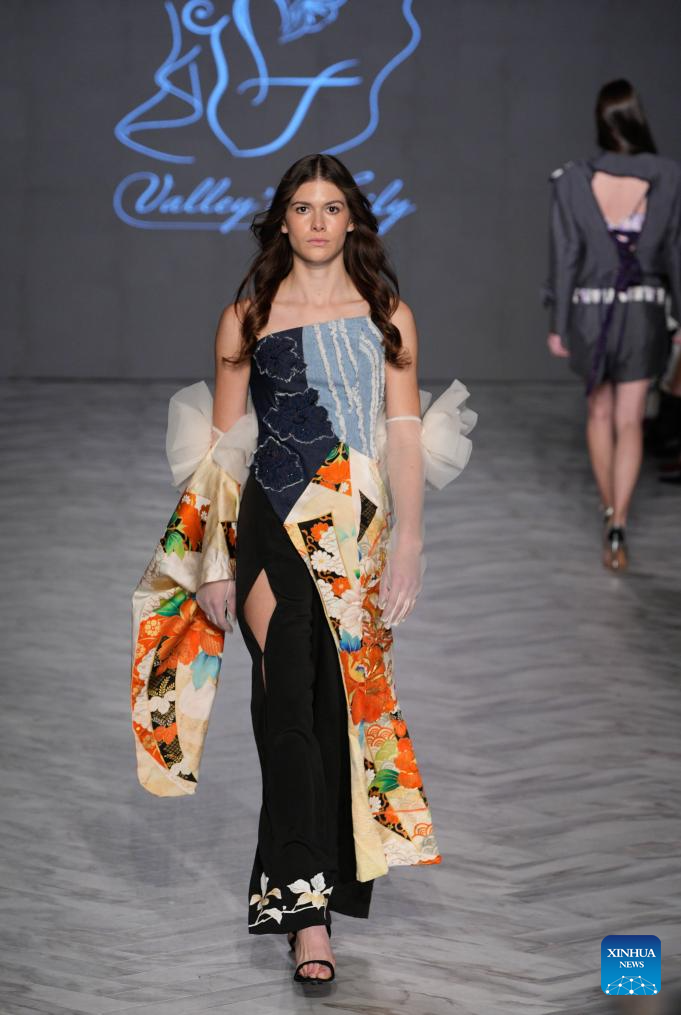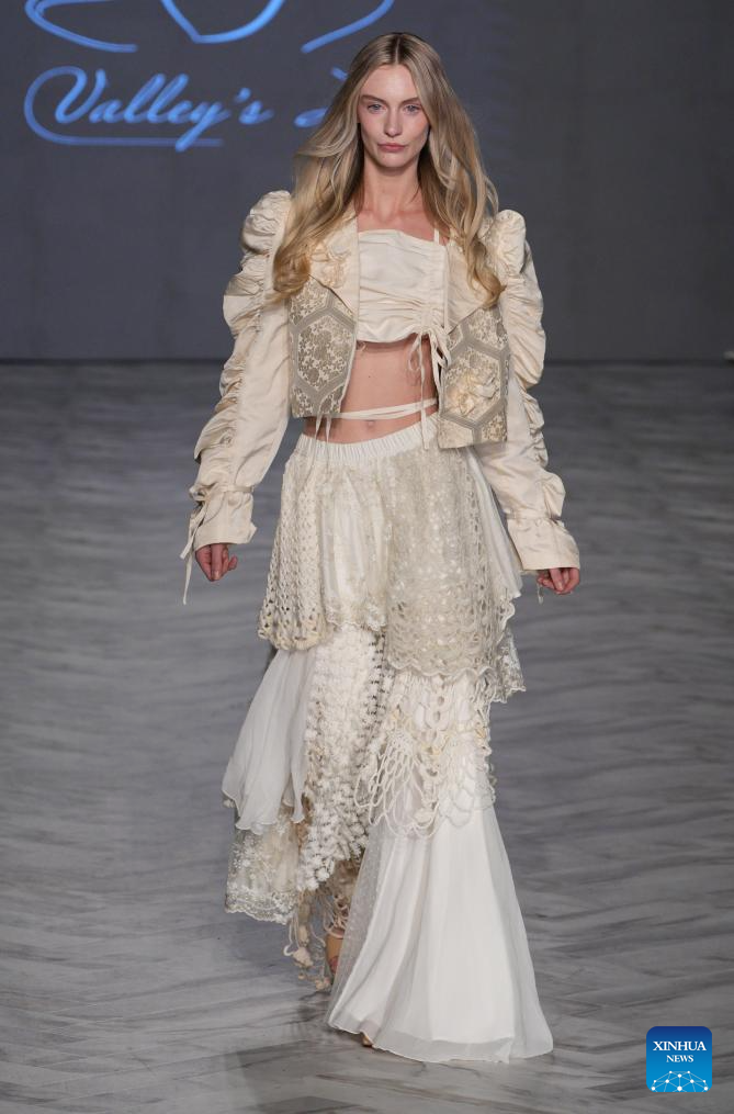VANCOUVER, 19 octubre, 2025 (Xinhua) -- Imagen del 18 de octubre de 2025 de una modelo presentando una creación de la marca japonesa Valley's Lily durante el desfile de las colecciones Primavera/Verano 2026 en la Semana de la Moda de Vancouver, en Vancouver, Columbia Británica, Canadá. (Xinhua/Liang Sen)