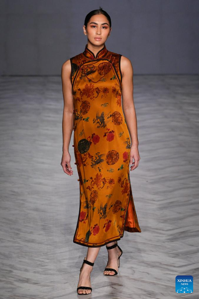 VANCOUVER, 19 octubre, 2025 (Xinhua) -- Imagen del 18 de octubre de 2025 de una modelo presentando una creación de la marca china de Jeph Yuting durante el desfile de las colecciones Primavera/Verano 2026 en la Semana de la Moda de Vancouver, en Vancouver, Columbia Británica, Canadá. (Xinhua/Liang Sen)