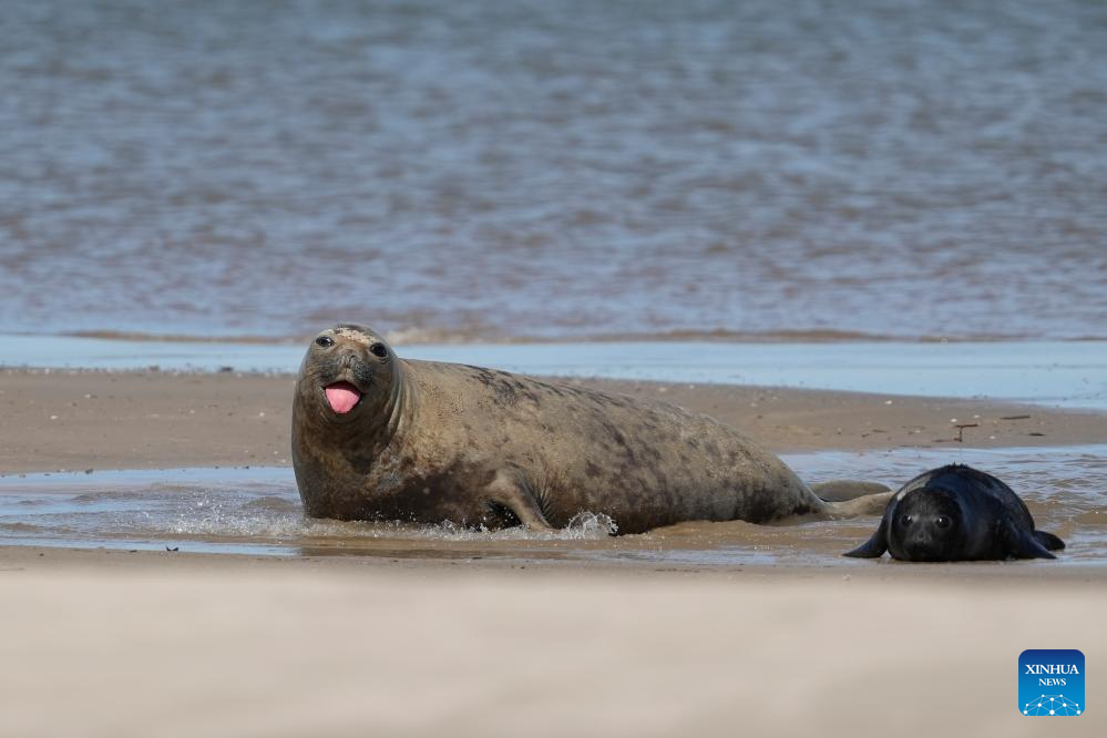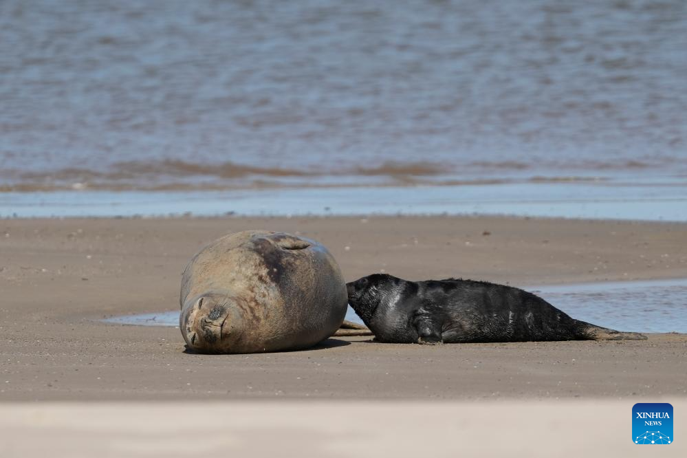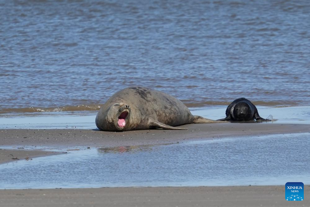 PIRIAPOLIS, 21 octubre, 2025 (Xinhua) -- Una niña y su padre observan a una elefanta marina mientras descansa junto a su cría en una playa, en Piriápolis, en el departamento de Maldonado, Uruguay, el 21 de octubre de 2025. (Xinhua/Nicolás Celaya)