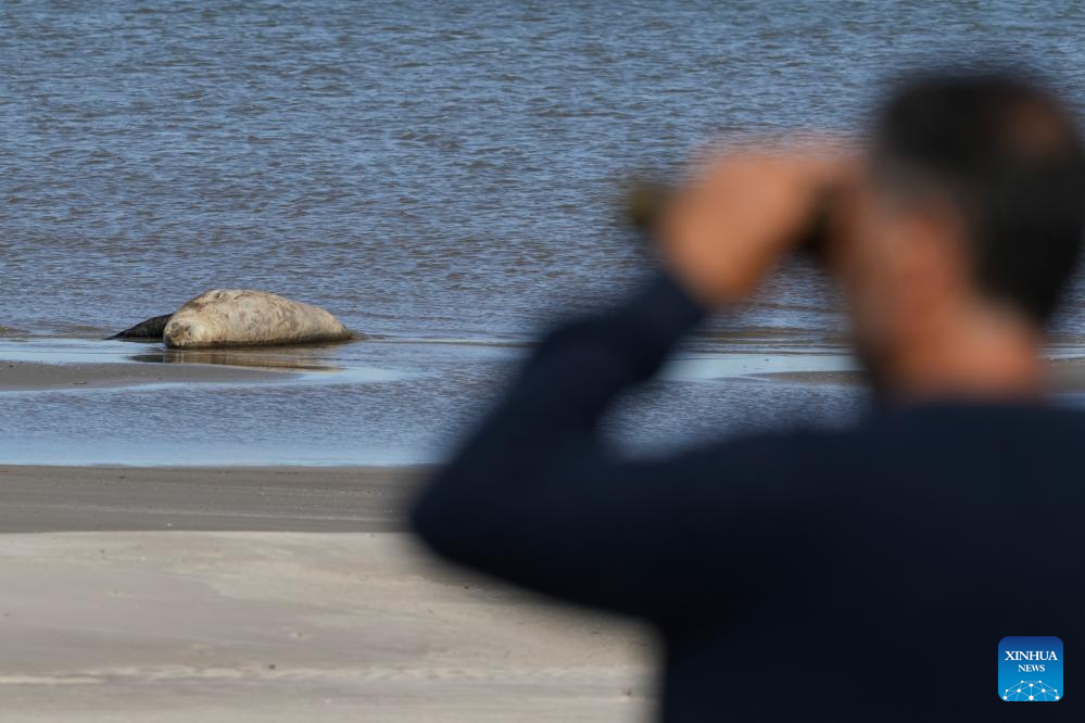 PIRIAPOLIS, 21 octubre, 2025 (Xinhua) -- Un hombre observa a una elefanta marina mientras amamanta a su cría en una playa, en Piriápolis, en el departamento de Maldonado, Uruguay, el 21 de octubre de 2025. (Xinhua/Nicolás Celaya)