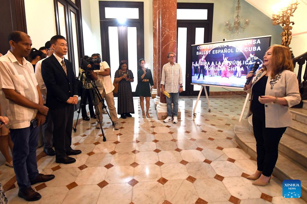 LA HABANA, 23 octubre, 2025 (Xinhua) -- Imagen del 22 de octubre de 2025 de la presidenta del Consejo de Artes Escénicas, Rachel García (d), hablando durante una conferencia de prensa sobre el anuncio oficial de una gira del Ballet Español de Cuba por China, en la Embajada de China en Cuba, en La Habana, capital de Cuba. El Ballet Español de Cuba, bajo la dirección del maestro Eduardo Veitía, iniciará el 27 de octubre su tercera gira por China, la cual se extenderá hasta diciembre de 2025. (Xinhua/Joaquín Hernández)
