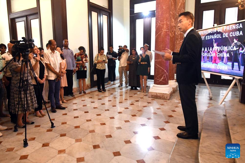 LA HABANA, 23 octubre, 2025 (Xinhua) -- Imagen del 22 de octubre de 2025 del embajador de China en Cuba, Hua Xin (d), hablando durante una conferencia de prensa sobre el anuncio oficial de una gira del Ballet Español de Cuba por China, en la Embajada de China en Cuba, en La Habana, capital de Cuba. El Ballet Español de Cuba, bajo la dirección del maestro Eduardo Veitía, iniciará el 27 de octubre su tercera gira por China, la cual se extenderá hasta diciembre de 2025. (Xinhua/Joaquín Hernández)
