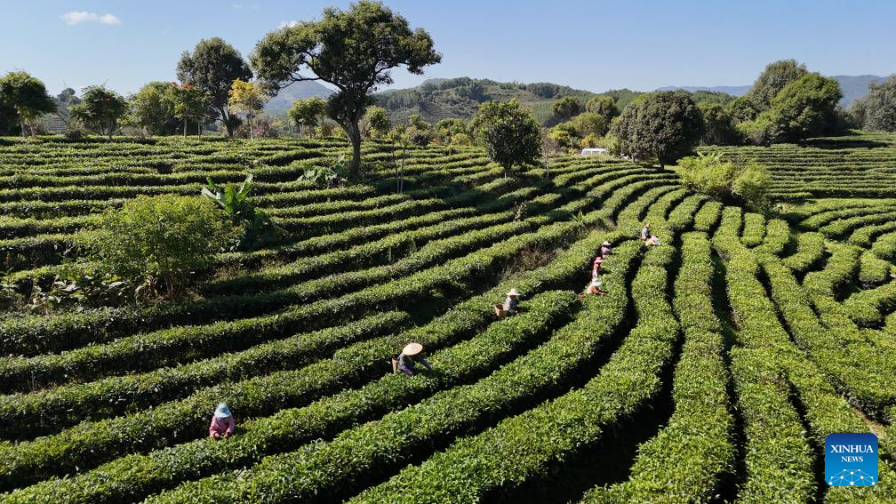 BEIJING, 23 octubre, 2025 (Xinhua) -- Vista aérea tomada con un dron del 23 de octubre de 2025 de agricultores recolectando hojas de té, en Pu'er, en la provincia de Yunnan, en el suroeste de China. El jueves se conmemora el Descenso de las Heladas. Como último término solar del otoño, el Descenso de las Heladas anuncia la llegada del invierno. (Xinhua/Yang Tingrong)