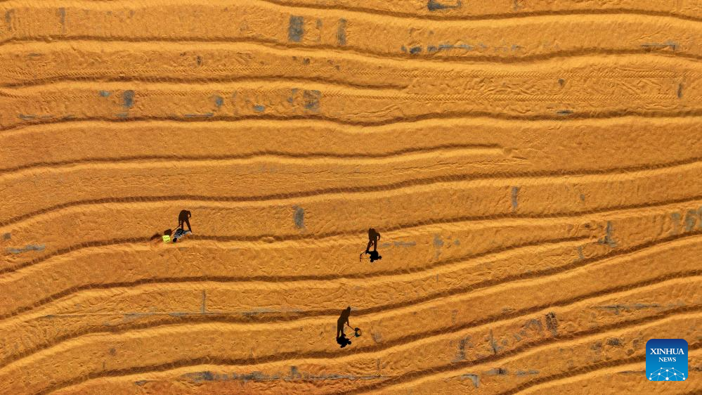 BEIJING, 23 octubre, 2025 (Xinhua) -- Imagen tomada con un dron del 23 de octubre de 2025 de un agricultor secando arroz, en Hengyang, en la provincia de Hunan, en el centro de China. El jueves se conmemora el Descenso de las Heladas. Como último término solar del otoño, el Descenso de las Heladas anuncia la llegada del invierno. (Xinhua/Cao Zhengping)