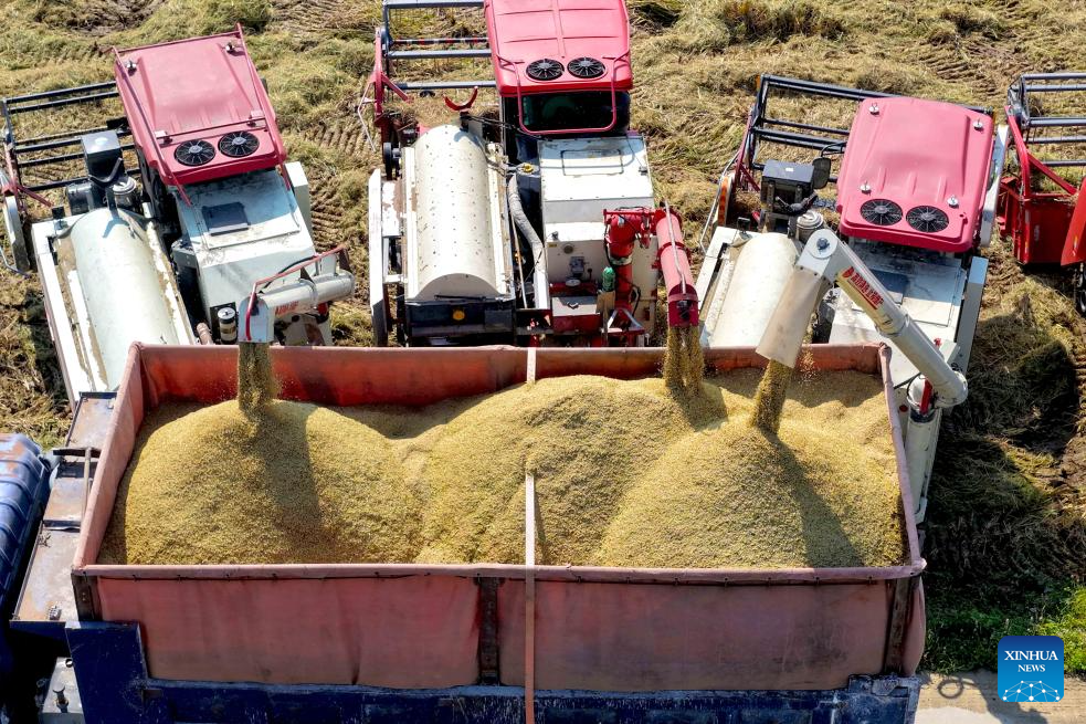 BEIJING, 23 octubre, 2025 (Xinhua) -- Vista aérea tomada con un dron del 23 de octubre de 2025 de segadoras cargando arroz cosechado, en Bozhou, en la provincia de Anhui, en el este de China. El jueves se conmemora el Descenso de las Heladas. Como último término solar del otoño, el Descenso de las Heladas anuncia la llegada del invierno. (Xinhua/Liu Qinli)