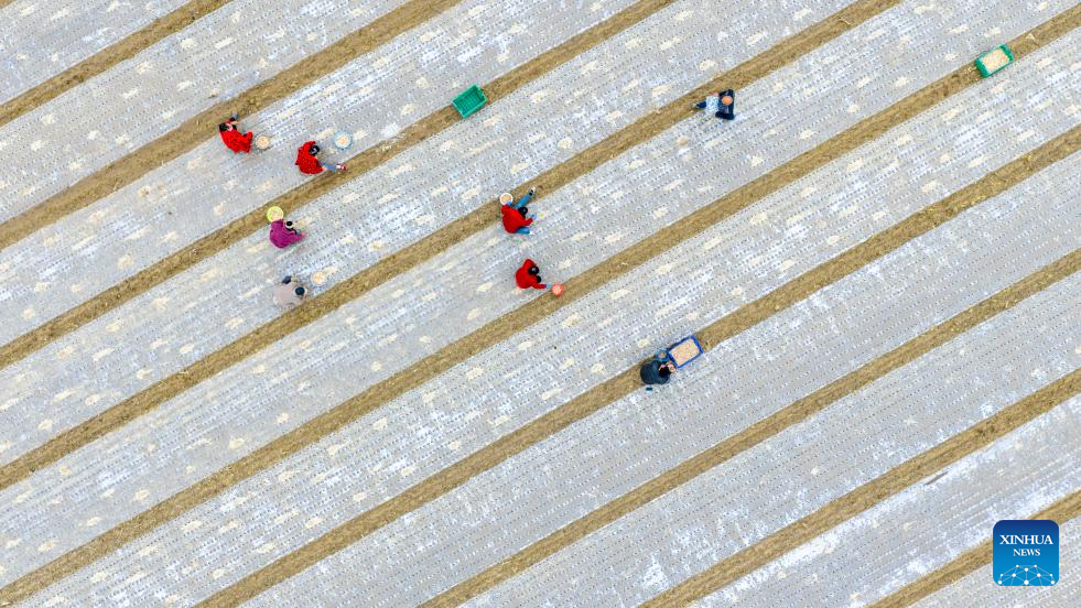 BEIJING, 23 octubre, 2025 (Xinhua) -- Vista aérea tomada con un dron del 23 de octubre de 2025 de agricultores plantando ajo, en Shangqiu, en la provincia de Henan, en el centro de China. El jueves se conmemora el Descenso de las Heladas. Como último término solar del otoño, el Descenso de las Heladas anuncia la llegada del invierno. (Xinhua/Xu Zeyuan)