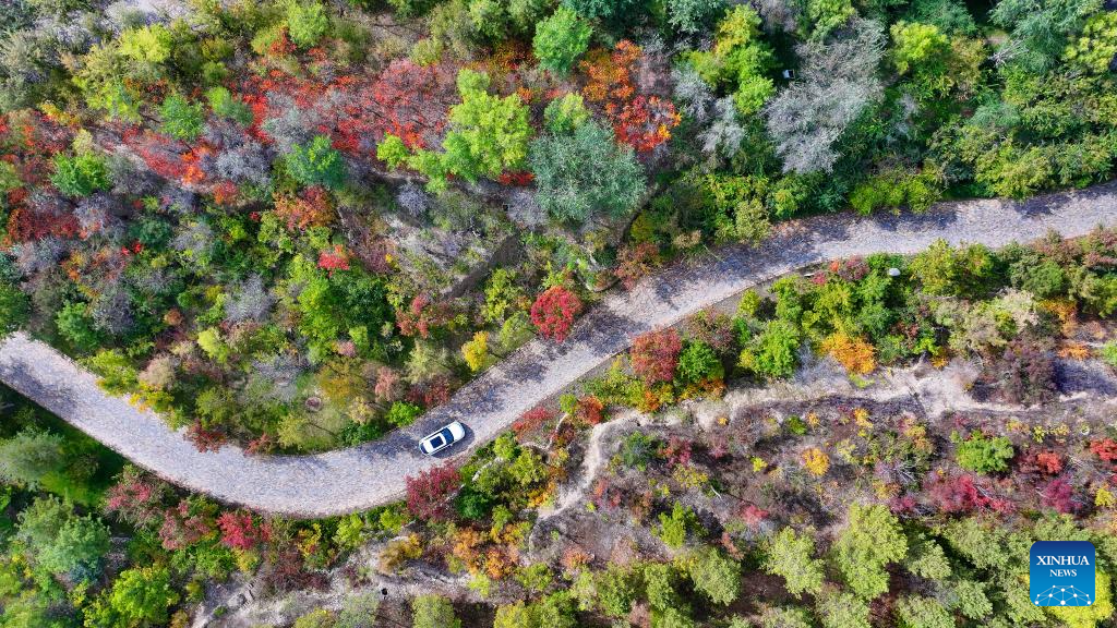 YINCHUAN, 23 octubre, 2025 (Xinhua) -- Vista aérea tomada con un dron el 13 de octubre de 2025 del paisaje otoñal del parque Haibao, en Yinchuan, en la región autónoma de la etnia hui de Ningxia, en el noroeste de China. (Xinhua/Li Jing)