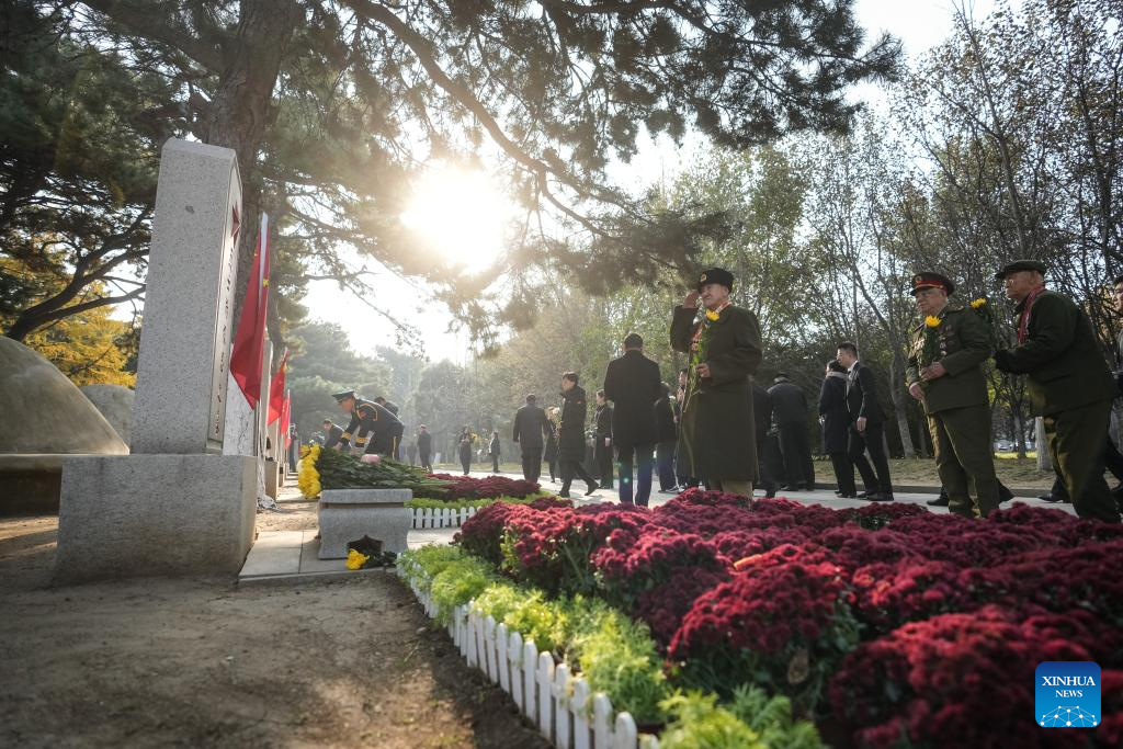 SHENYANG, 25 octubre, 2025 (Xinhua) -- Veteranos de los Voluntarios del Pueblo Chino (VPCh) presentan flores a los mártires de los VPCh en el cementerio de los mártires de los VPCh, en Shenyang, en la provincia de Liaoning, en el noreste de China, el 25 de octubre de 2025. La provincia de Liaoning realizó el sábado ceremonias de presentación de cestas de flores en Shenyang y Dandong para conmemorar el 75º aniversario del ingreso a la República Popular Democrática de Corea de los VPCh para luchar en la Guerra de Resistencia contra la Agresión de Estados Unidos y de Ayuda a Corea. (Xinhua/Pan Yulong)