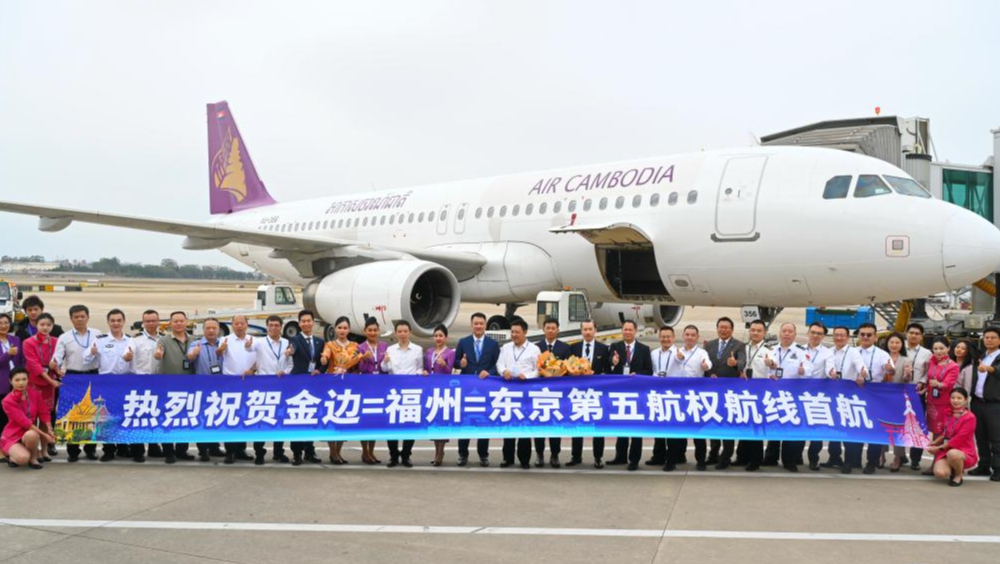 FUZHOU, 26 octubre, 2025 (Xinhua) -- Una ceremonia para marcar el lanzamiento del primer vuelo de Fujian que obtuvo la Quinta Libertad del Aire se lleva a cabo en el Aeropuerto Internacional Changle de Fuzhou, en Fuzhou, en la provincia de Fujian, en el sureste de China, el 26 de octubre de 2025. El primer vuelo de Fujian que obtuvo la Quinta Libertad del Aire, la ruta "Phnom Penh-Fuzhou-Tokio", fue oficialmente lanzada el domingo. La Quinta Libertad del Aire se refiere al derecho otorgado a una aerolínea de un país de hacer escala en un tercer país mientras opera una ruta internacional, lo que le permite cargar y descargar allí pasajeros y carga. (Xinhua/Lin Shanchuan)