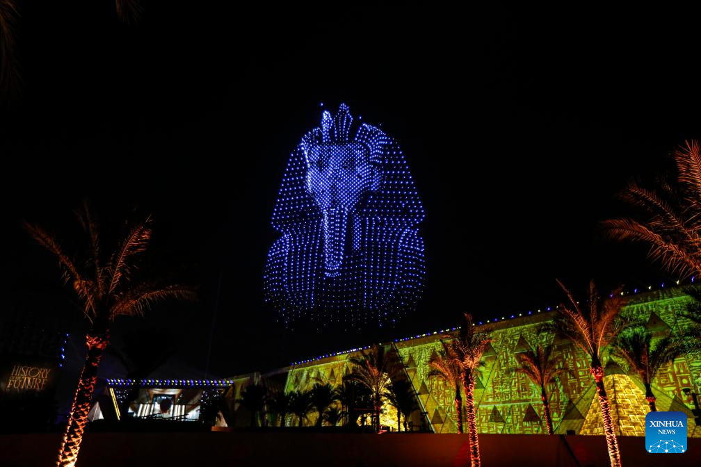 GIZA, 2 noviembre, 2025 (Xinhua) -- Imagen del 1 de noviembre de 2025 de un espectáculo de luces y drones durante la inauguración del Gran Museo Egipcio (GME), en Giza, Egipto. Luego de dos décadas de construcción, Egipto inauguró el sábado el GME, el museo más grande del mundo dedicado a una sola civilización, con una gran ceremonia realizada cerca de las pirámides y la Esfinge, en un histórico evento cultural para el país reconocido por su rica herencia. (Xinhua/Ahmed Gomaa)