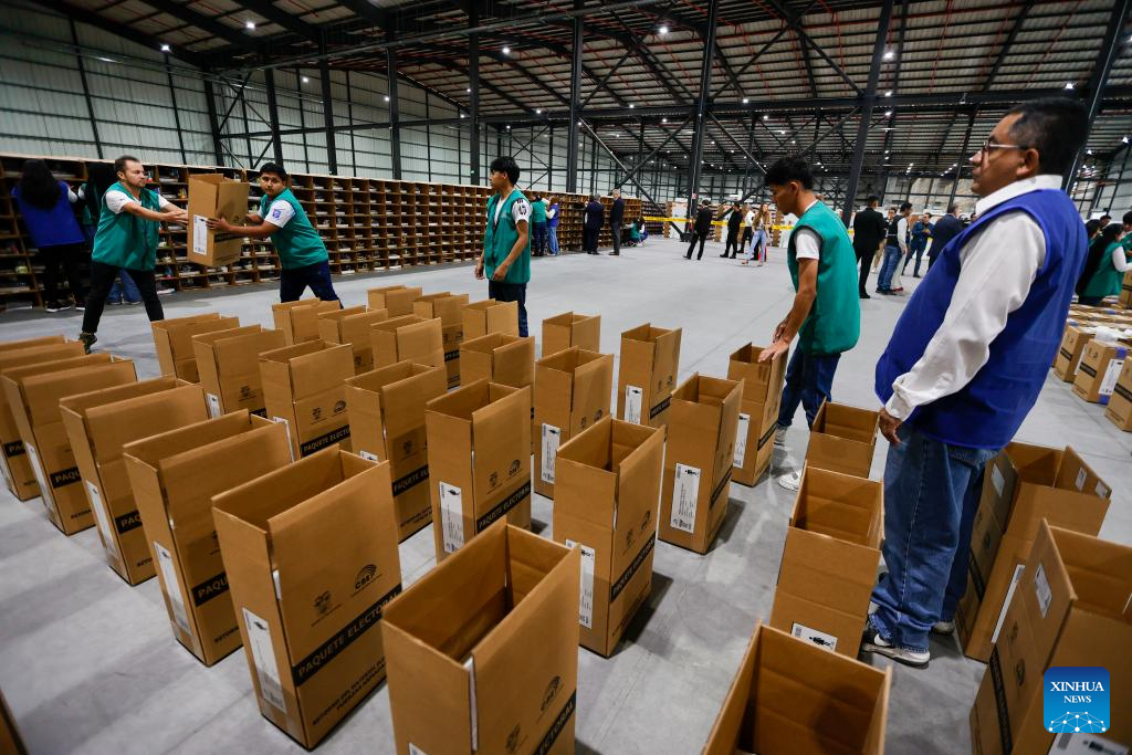 QUITO, 3 noviembre, 2025 (Xinhua) -- Un empleado revisa paquetes electorales almacenados y clasificados por provincia durante la presentación de los avances logísticos para el próximo proceso electoral, en las instalaciones de la empresa integradora Montgar, en la localidad de Pifo, en el extremo nororiental de Quito, Ecuador, el 3 de noviembre de 2025. El Consejo Nacional Electoral de Ecuador avanza en el proceso de armado y distribución de los paquetes electorales que se utilizarán en la consulta popular y el referendo constitucional convocados por el Gobierno para el próximo 16 de noviembre, informó el lunes la presidenta del organismo, Diana Atamaint. (Xinhua/Ricardo Landeta)