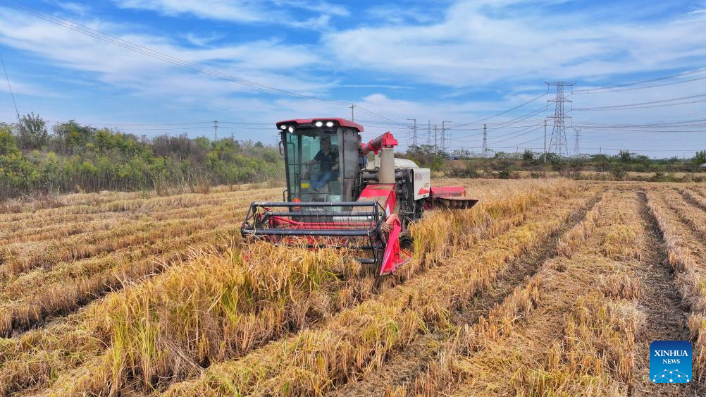 BEIJING, 3 noviembre, 2025 (Xinhua) -- Vista aérea tomada con un dron el 2 de noviembre de 2025 de un agricultor cosechando arroz, en la ciudad de Zunhua, en la provincia de Hebei, en el norte de China. Para el 30 de octubre, se ha cosechado más del 90 por ciento de los cereales de otoño y se ha sembrado más del 25 por ciento del trigo de invierno en todo el país. (Xinhua/Liu Mancang)