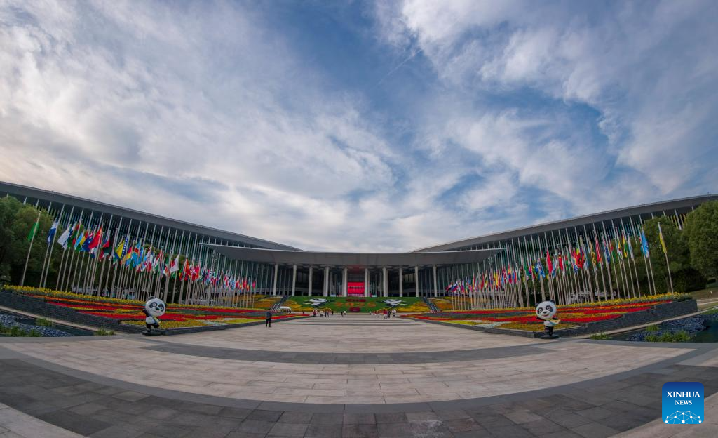 SHANGHAI, 3 noviembre, 2025 (Xinhua) -- Imagen del 3 de noviembre de 2025 de la plaza sur del Centro Nacional de Exposiciones y Convenciones (Shanghai), la sede principal de la VIII Exposición Internacional de Importaciones de China (CIIE, por sus siglas en inglés), en Shanghai, en el este de China. La VIII CIIE se celebrará en Shanghai del 5 al 10 de noviembre. (Xinhua/Fang Zhe)