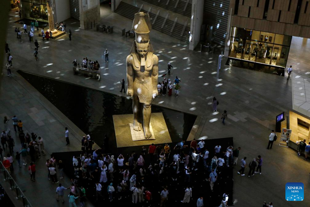 EL CAIRO, 4 noviembre, 2025 (Xinhua) -- Turistas se reúnen alrededor del coloso del antiguo faraón egipcio Ramsés II, en el Gran Museo Egipcio (GEM, por sus siglas en inglés), en Giza, Egipto, el 4 de noviembre de 2025. El GEM, el museo más grande del mundo dedicado a una sola civilización, abrió sus puertas al público el martes. (Xinhua/Ahmed Gomaa)