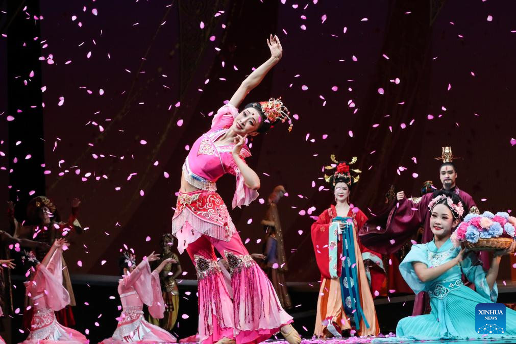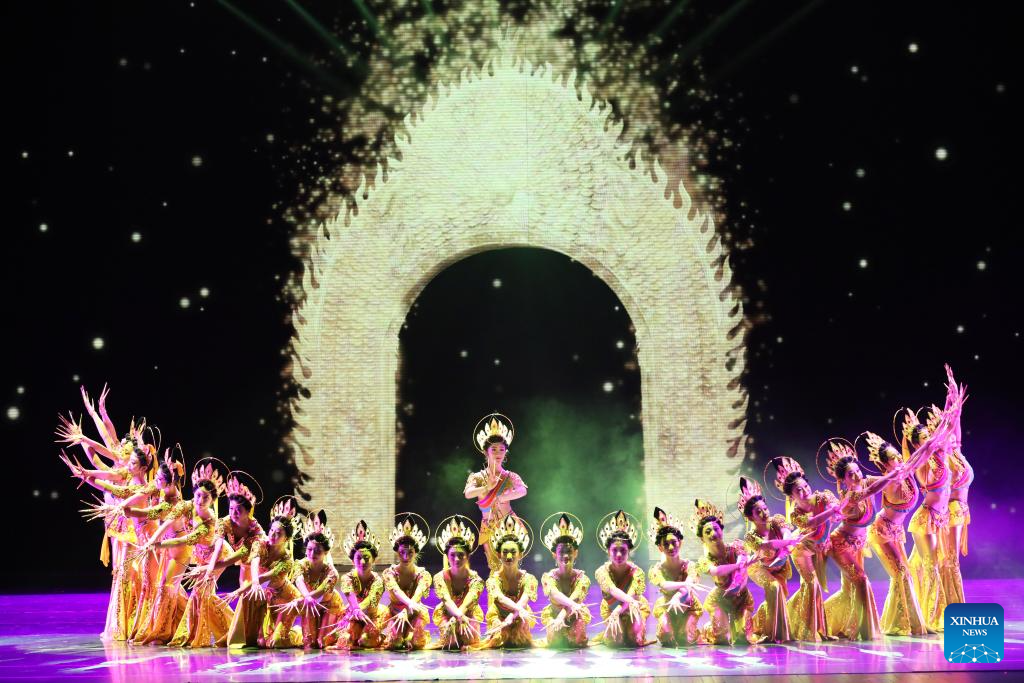 LANZHOU, 4 noviembre, 2025 (Xinhua) -- Imagen del 20 de septiembre de 2025 del drama de danza "Flores Llueven a lo largo de la Ruta de la Seda" siendo presentado en el Teatro de Dunhuang, en Dunhuang, en la provincia de Gansu, en el noroeste de China. La danza Dunhuang se refiere a un estilo de danza que tiene como objetivo dar vida a las figuras icónicas representadas en los antiguos murales de las Grutas de Mogao. Inspirándose en temas históricos, artistas contemporáneos han creado obras maestras de música y danza, como el clásico drama de danza "Flores Llueven a lo largo de la Ruta de la Seda", y "Bodhisattva de las Mil Manos". (Xinhua/Lang Bingbing)
