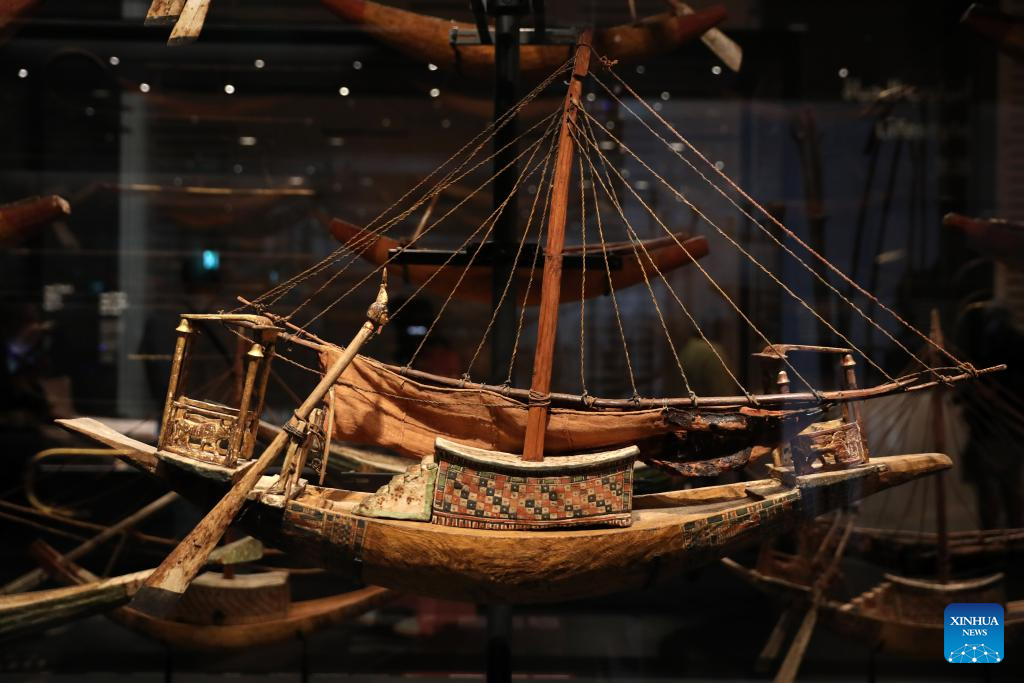 GIZA, 5 noviembre, 2025 (Xinhua) -- Imagen del 4 de noviembre de 2025 del modelo de un bote en la sala de exposiciones del rey Tutankamón del Gran Museo Egipcio (GEM, por sus siglas en inglés), en Giza, Egipto. El GEM abrió sus puertas al público el martes, consolidándose como una de las mayores exhibiciones de reliquias antiguas del mundo y una fortaleza de alta tecnología dedicada a la conservación del patrimonio. (Xinhua/Sui Xiankai)