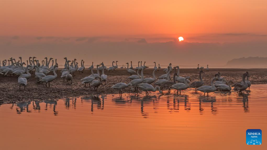 BEIJING, 5 noviembre, 2025 (Xinhua) -- Vista aérea tomada con un dron el 5 de noviembre de 2025 de cisnes alimentándose en una reserva natural, en la ciudad de Rongcheng, en la provincia de Shandong, en el este de China. (Xinhua/Li Xinjun)