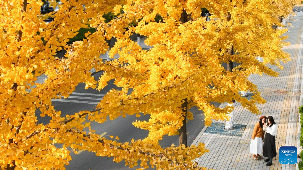 BEIJING, 5 noviembre, 2025 (Xinhua) -- Vista aérea tomada con un dron el 3 de noviembre de 2025 de personas admirando los árboles de ginkgo, en la ciudad de Zouping, en la provincia de Shandong, en el este de China. (Xinhua/Dong Naide)